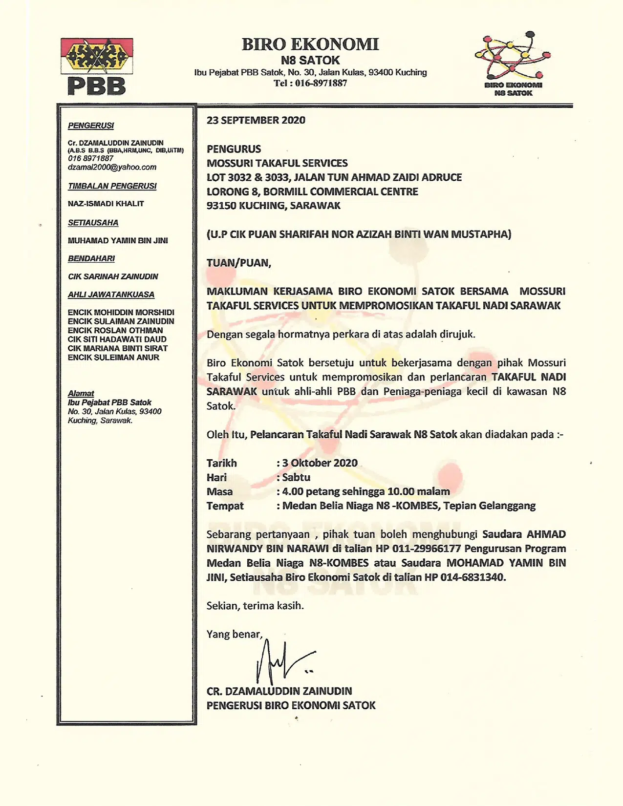 Mossuri Takaful Services telah diberi kepercayaan untuk mereka satu skim takaful kelompok khas untuk rakyat Sarawak iaitu Nadi Sarawak dan syarikat juga diberi kepercayaan untuk bekerjasama dengan National Football Development dalam menyediakan takaful kelompok untuk pelatih-pelatih seluruh Sarawak. Kami bersedia untuk memberi perkhidmatan kepada semua golongan masyarakat dalam menyediakan perlindungan takaful dan perancangan harta pusaka Islam.