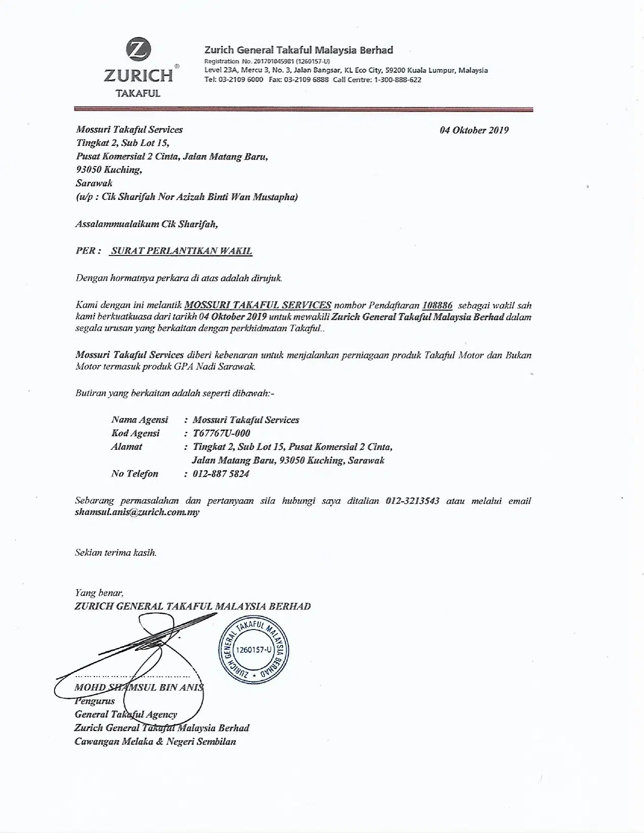 Ditubuhkan pada 2017 dan dimiliki sepenuhnya oleh Puan Sharifah Nor Azizah Binti Wan Mustapha. Mossuri Takaful Services adalah agensi korporat yang berdaftar di bawah Zurich General Takaful Malaysia Berhad & Etiqa General Takaful Berhad dan beliau juga berdaftar di bawah Wasiyyah Shoppe Berhad dalam menjalankan khidmat pengurusan Harta Pusaka Islam.